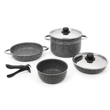 Pentole in alluminio puro 99,5%. Rivestimento antiaderente per alimenti. Batteria da 7 pezzi, capacità max 3,9 L, adatta a 3 persone.